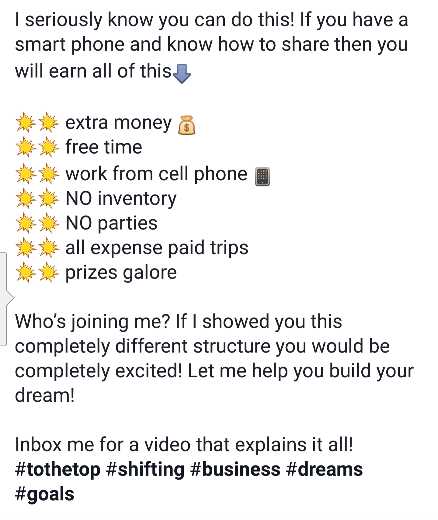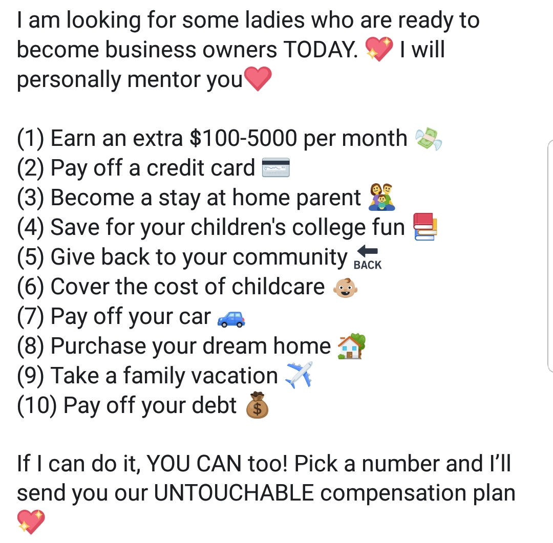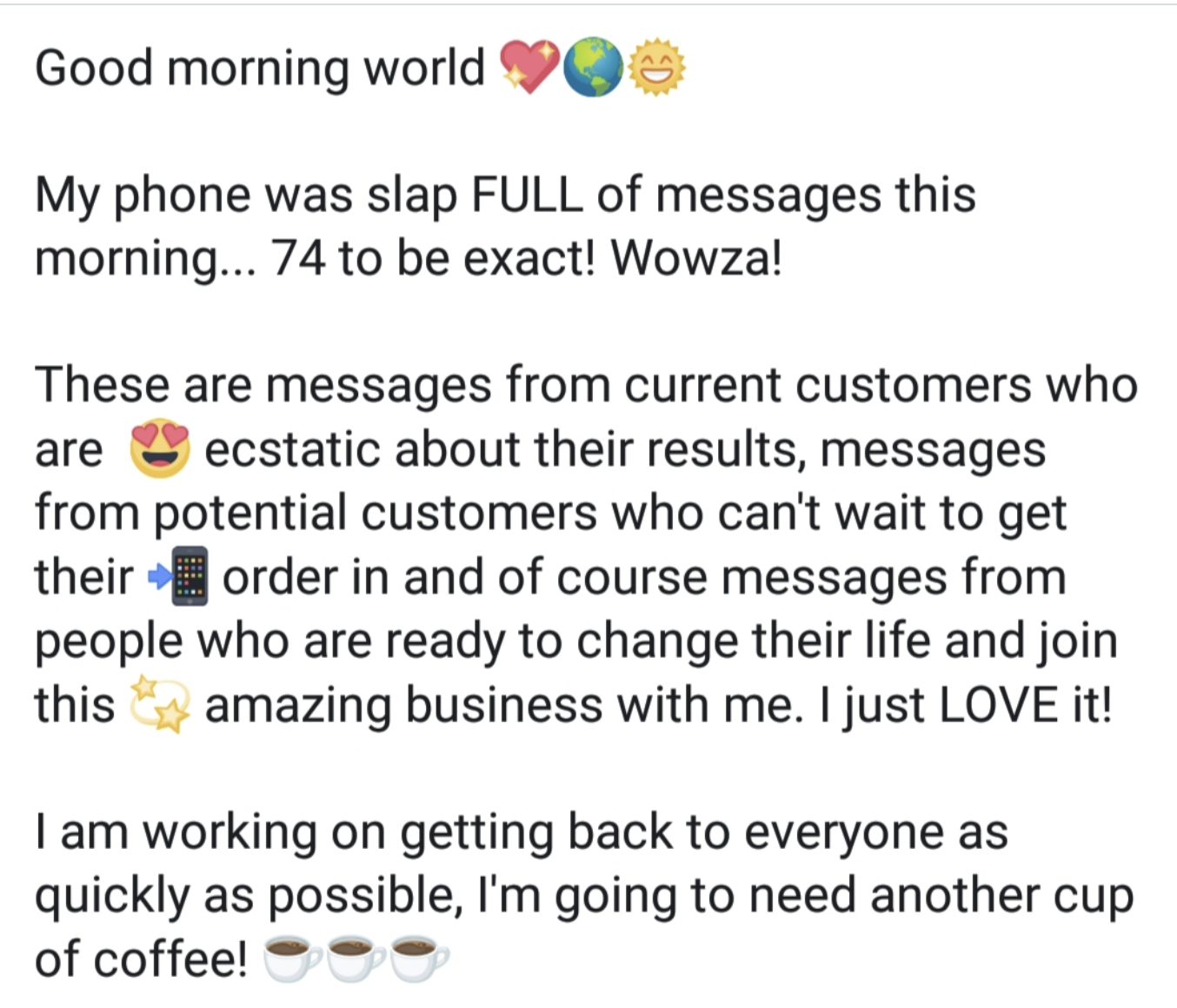 By keeping posts generic, you can focus on pain points and desires (extra income, flexibility, wellness, etc.) that your ideal business partners are already thinking about. This helps attract people who resonate with your vision—not just the product.